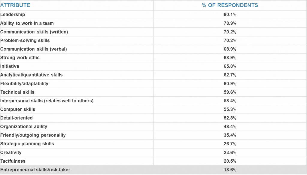 The National Association of Colleges and Employers conducted a survey in the fall of 2015 about the attributes that employers seek. The survey asked employers from a variety of fields what they consider to be the most important attributes of those seeking employment with their companies. Figure 1 below shows the results of that survey.