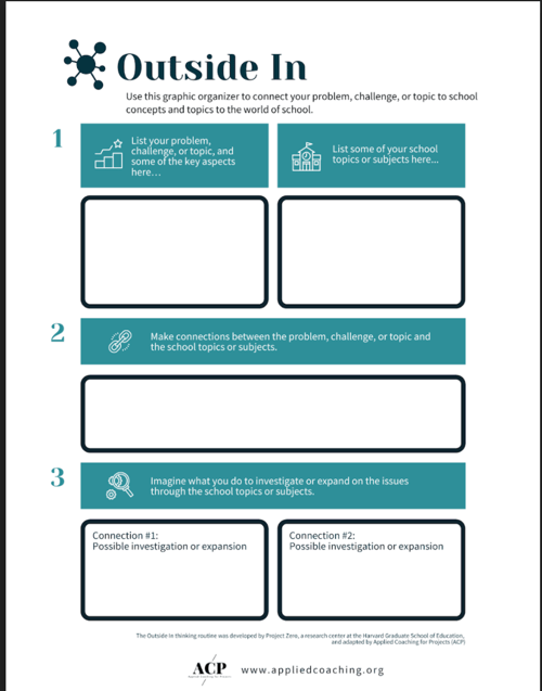 Now, if the problem or topic does not appear to connect directly to school content, try the adapted version of the Visible Thinking Routine – Outside In – below.