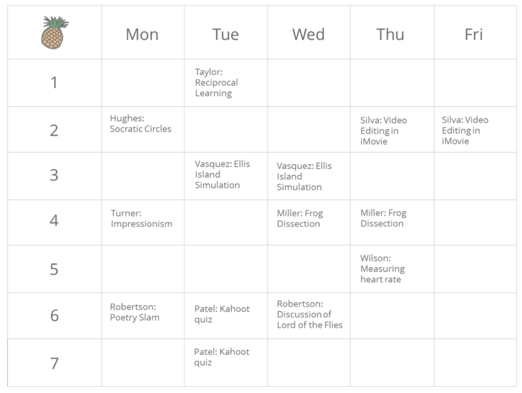 Learning together is another essential component of collaboration. When teachers learn together, they share ideas and strategies to use in the classroom. PLC meetings can serve this purpose, however, they only offer “sit and get” professional learning. The best kinds of learning happen when you see it modeled, or you do it yourself. A pineapple chart can accomplish this exact purpose. A pineapple chart is a way to allow your teachers to observe each other without the stress of a formal review or feedback. It is truly a method designed for teachers by teachers. How it works is simple. Find a location that is a common place for teachers, i.e. the copy room or staff lounge. Make sure it’s a location not visited by administrators often. Use either a bulletin board or a white board to create a weekly schedule detailing all the designated time blocks in the day. See the figure below for an example.